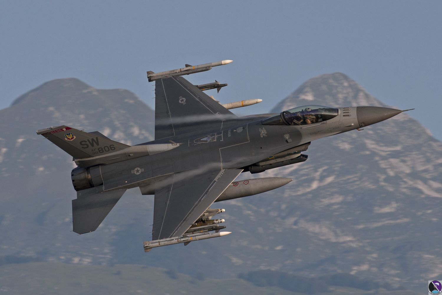 • A U.S. Air Force F-16 Fighting Falcon from the 510th Fighter Squadron ascends at Aviano Air Base, Italy, June 25, 2020. The F-16 is able to fly more than 500 miles, deliver its weapons with superior accuracy, defend itself against enemy aircraft, and return to its starting point. (U.S. Air Force photo by Airman 1st Class Thomas S. Keisler IV)